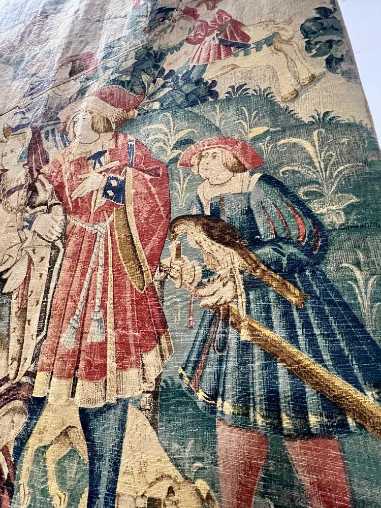 ➖ Beautiful large tapestry depicting a medieval hunting scene, with a crossbow and a falcon, circa 1900, reproduction of a 16th century tapestry, well-done restoration on the height at the back of the work. Nice decorative object