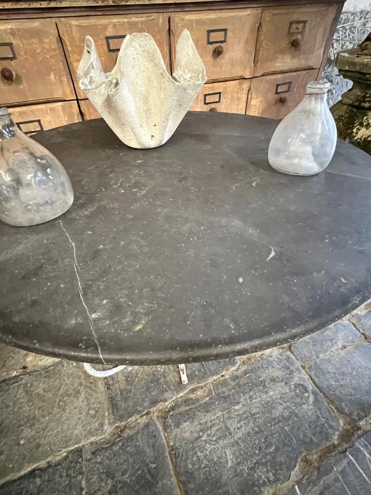 ➖ Rare garden pedestal table in metal and blue stone top, circa 1900, very special base, original patina. Perfect condition ✖️ Width 94 cm - Height 75 cm